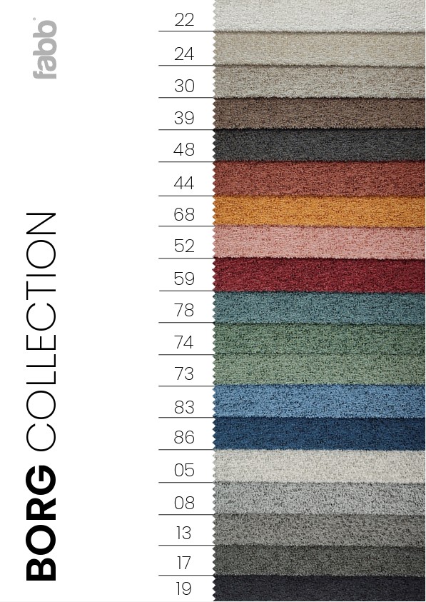Kolekce BORG patří do skupiny produktů, jejichž jemný vzorovaný efekt pramení z tkaní. Vyznačuje se velmi decentním vzorem, který jí dodává na atraktivitě, zatímco melanžový efekt zdůrazňuje její trojrozměrnost. Do hustě tkaného základu produktu byly zapracovány silnější útkové příze, které byly následně podrobeny procesu škrábání, čímž se některá vlákna jemně rozplétají a vytahují nad povrch. Tento proces má za cíl dodat látce měkký pocit. Rubová strana materiálu je vyztužena měkkou netkanou textilií.